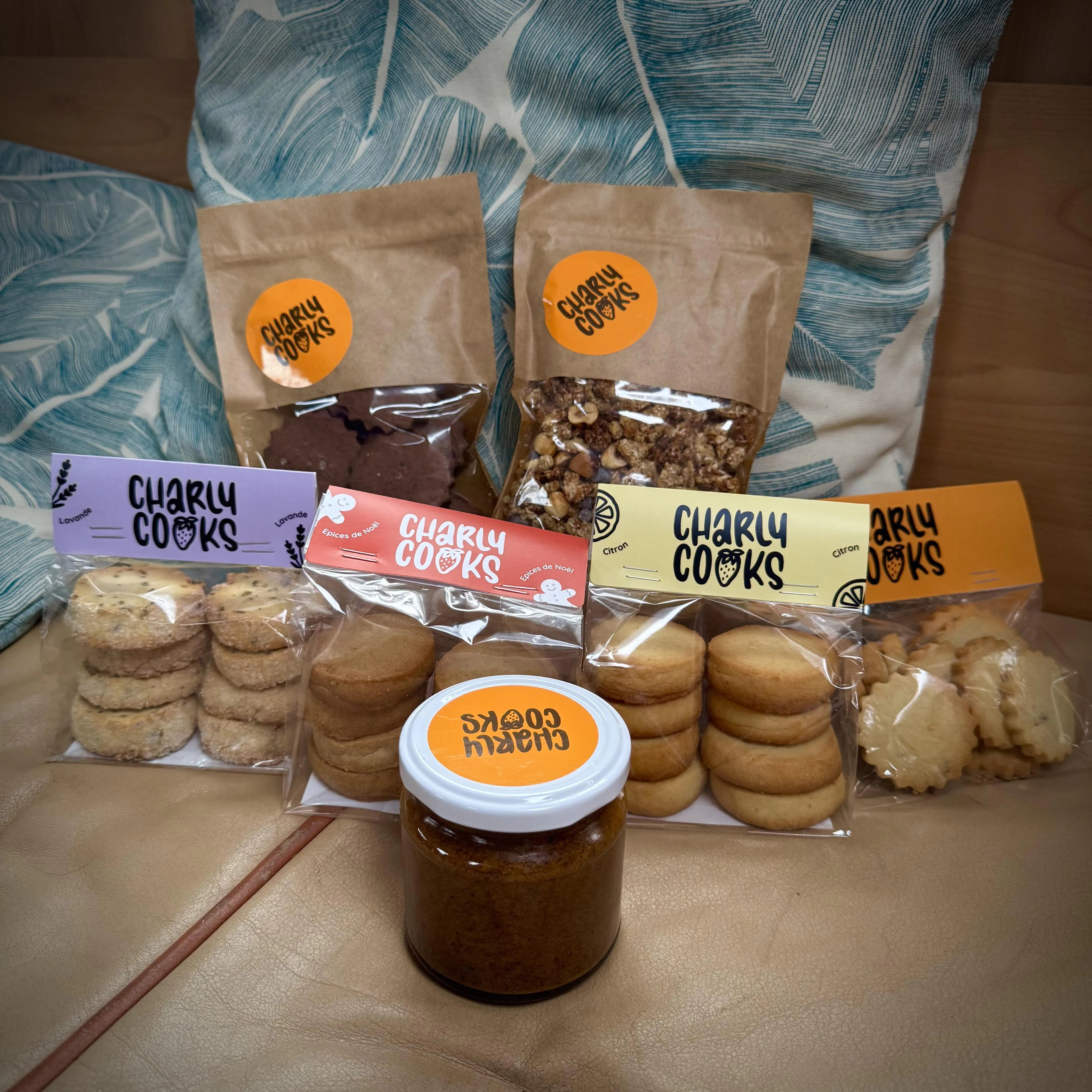 Une sélection artisanale de granola croustillant, de praliné fondant (amande noisettes) et de 3 types de biscuits.